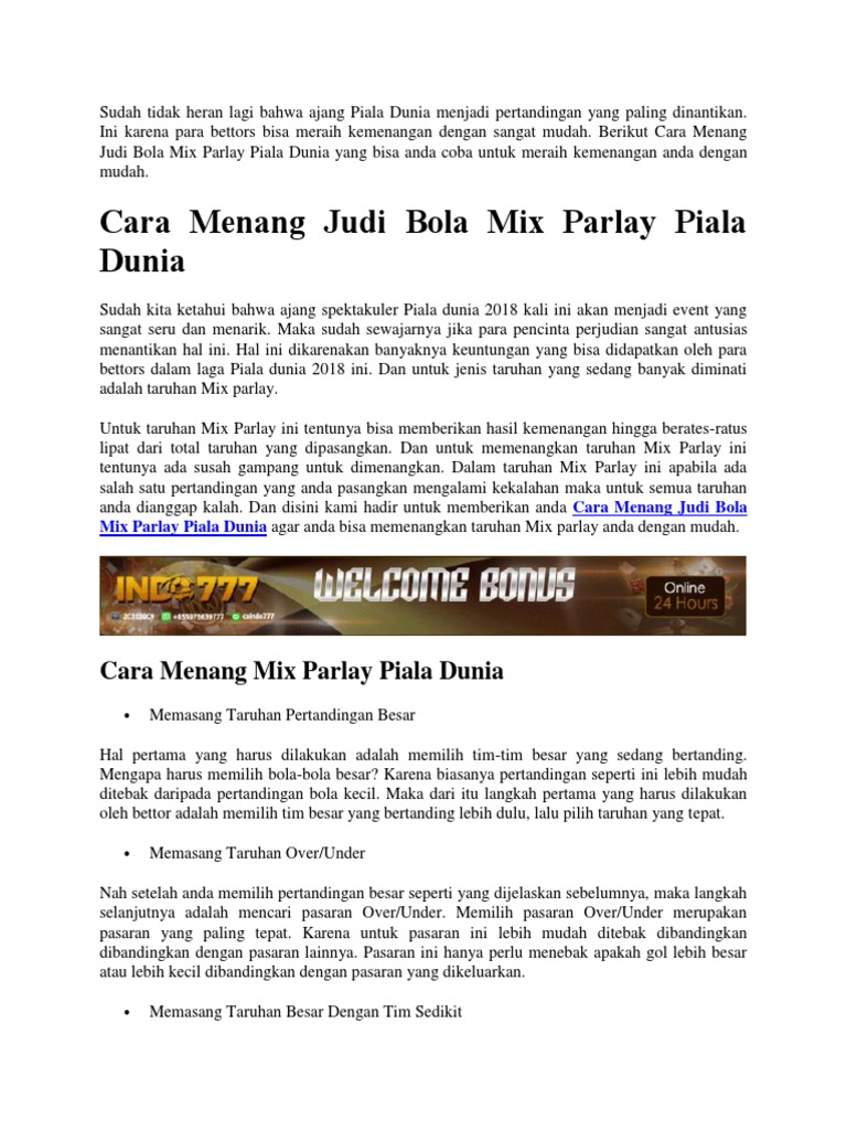 Ada lagi satu tata cara taruhan bola biar menang terus. Cara menang judi bola mix parlay. Cara taruhan bola online pada dasarnya merupakan salah satu langkah untuk menghabiskan waktu luang dengan mencoba mendapatkan keuntungan. Dengan kedua cara tersebut, sudah dipastikan pasaran yang disediakan bandar akan bisa selalu anda matikan dengan telak. Namun yang jelas, uang kemenangan atau kekalahan dalam taruhan yang dilakukan sangat dipengaruhi oleh nilai odds.